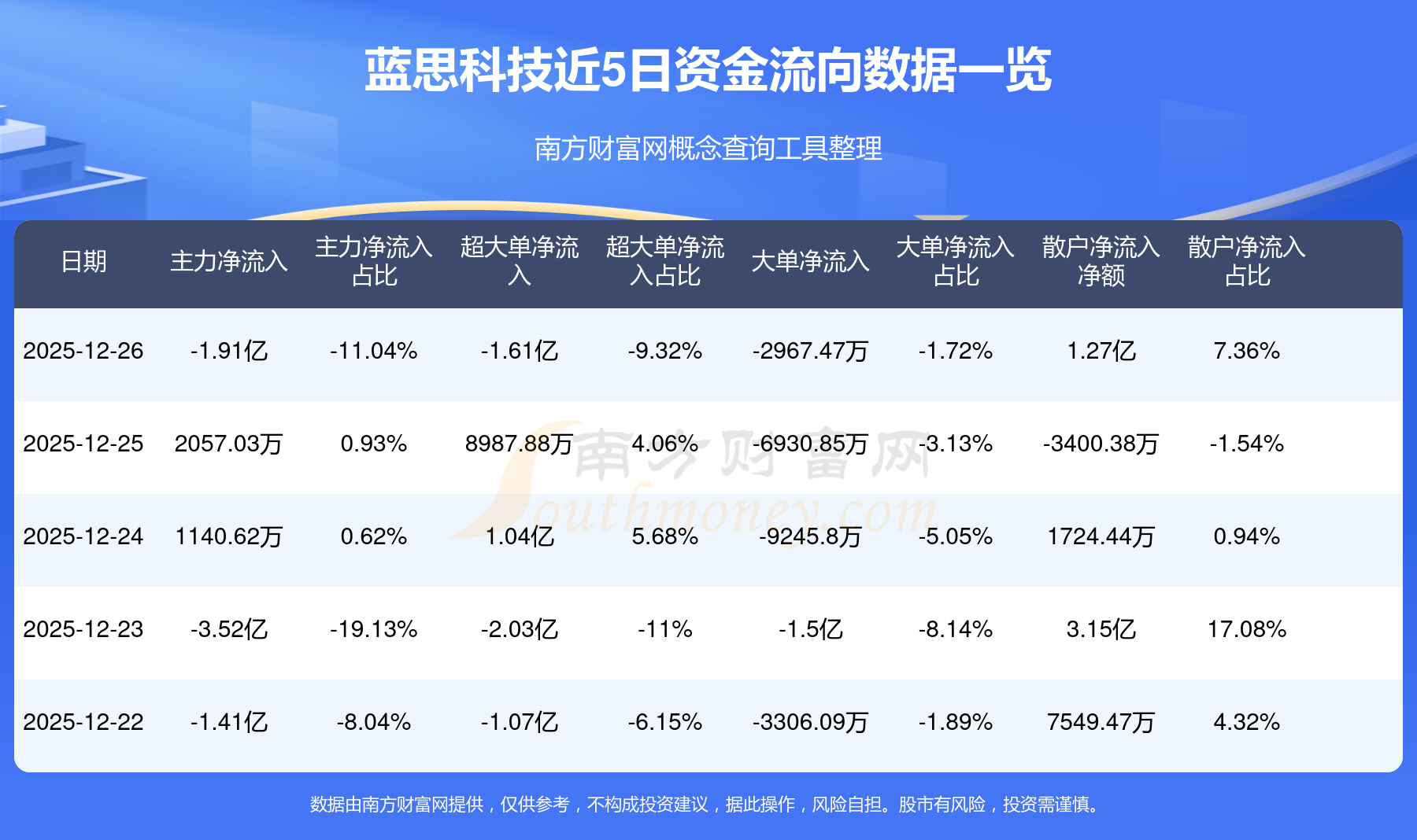 12月26日消息,藍思科技主力凈流出1.91億元,超大單凈流出1.61億元,散戶凈流入1.27億元。