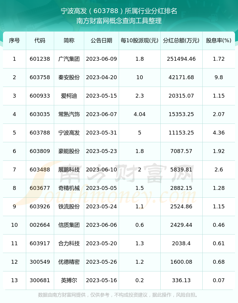 按照南方財(cái)富網(wǎng)趨勢選股系統(tǒng)統(tǒng)計(jì),寧波高發(fā)所屬行業(yè)為汽車零部件行業(yè),汽車零部件行業(yè)分紅排名情況如下表: