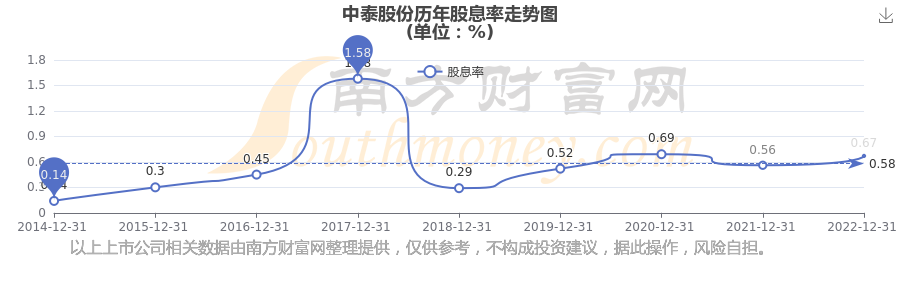 近年中泰股份年度股息率走勢如下圖: