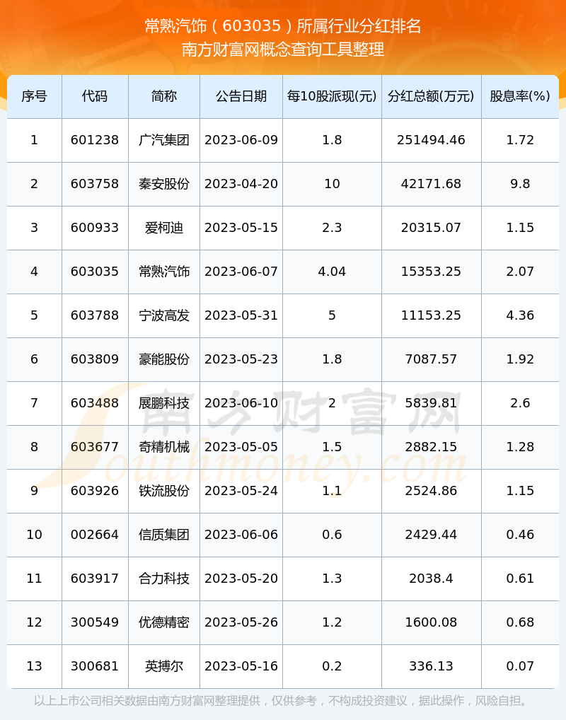 按照南方財(cái)富網(wǎng)趨勢(shì)選股系統(tǒng)統(tǒng)計(jì),常熟汽飾所屬行業(yè)為汽車(chē)零部件行業(yè),汽車(chē)零部件行業(yè)分紅排名情況如下表: