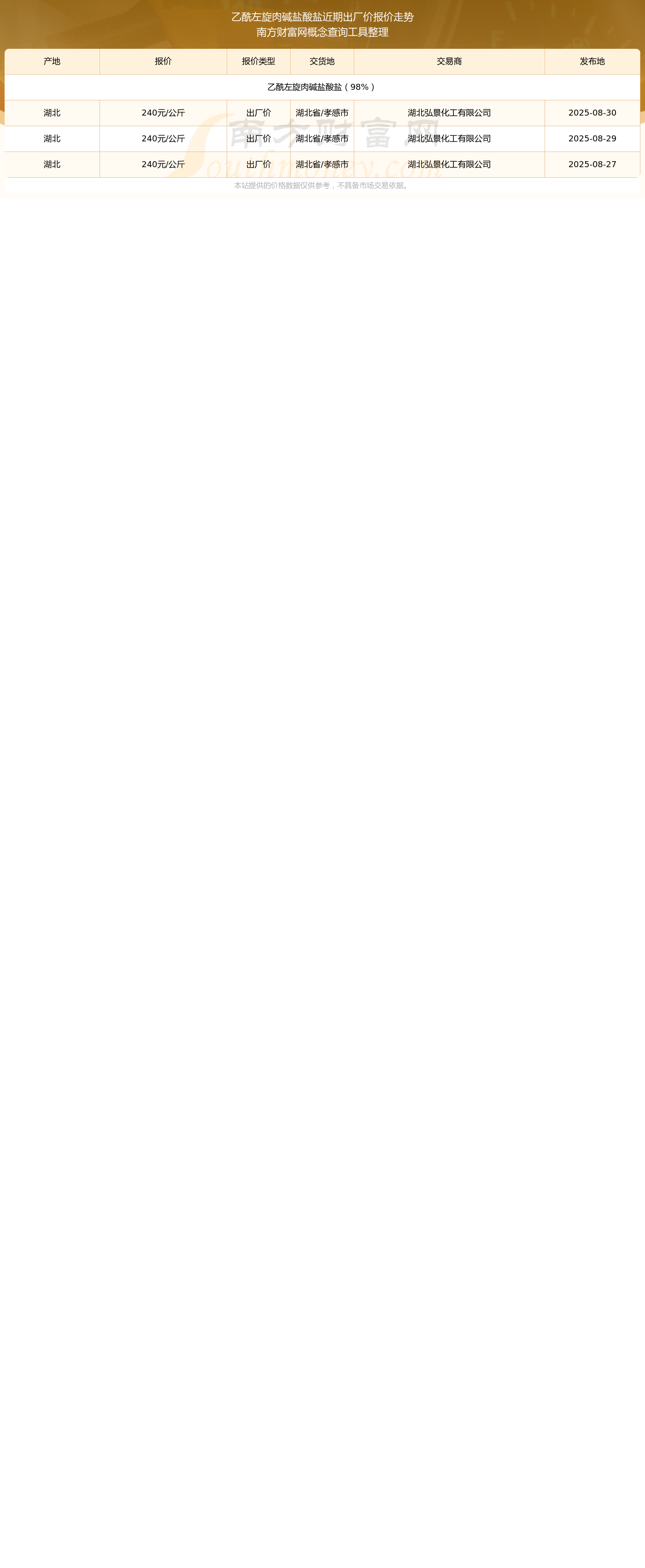2025年8月30日,乙酰左旋肉堿鹽酸鹽(98%)出廠價價格為240.00元/公斤,報價人:湖北弘景化工有限公司,交易地點為湖北省/孝感市。