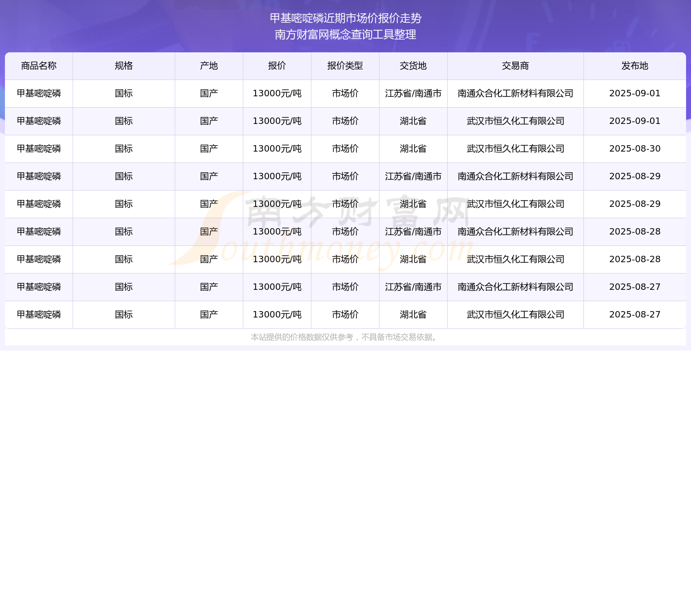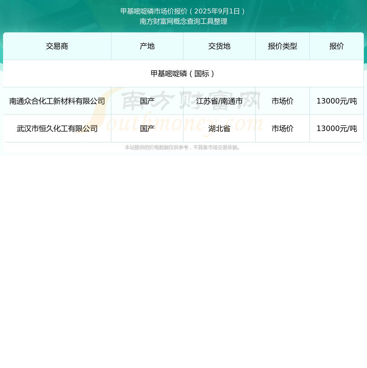 2025年9月1日,南通眾合化工新材料有限公司甲基嘧啶磷(國標(biāo)),國產(chǎn),交易地點(diǎn)為江蘇省/南通市,市場價(jià)報(bào)價(jià)為13000.00元/噸。