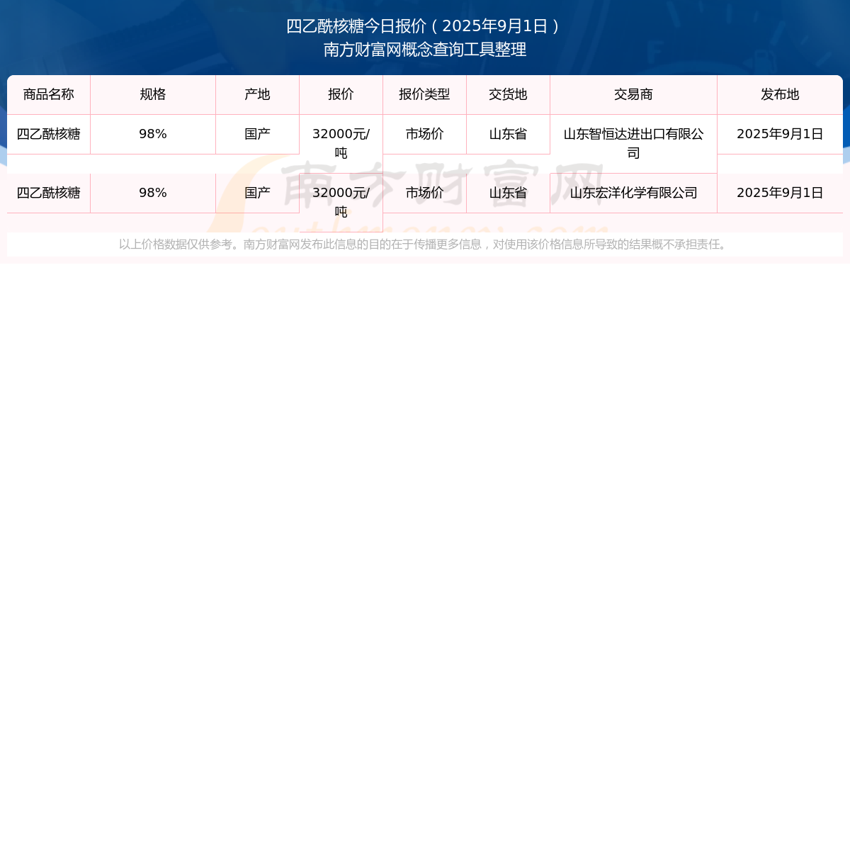 2025年9月1日,山東智恒達進出口有限公司四乙酰核糖(98%),國產(chǎn),交易地點為山東省,報價為32000.00元/噸。