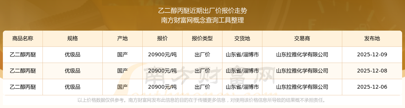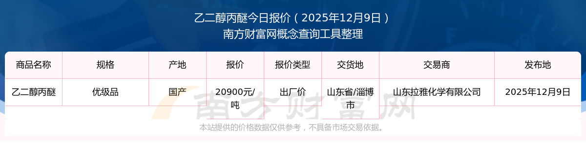 2025年12月9日,山東拉雅化學(xué)有限公司乙二醇丙醚(優(yōu)級(jí)品),國(guó)產(chǎn),交易地點(diǎn)為山東省/淄博市,出廠價(jià)報(bào)價(jià)為20900.00元/噸。