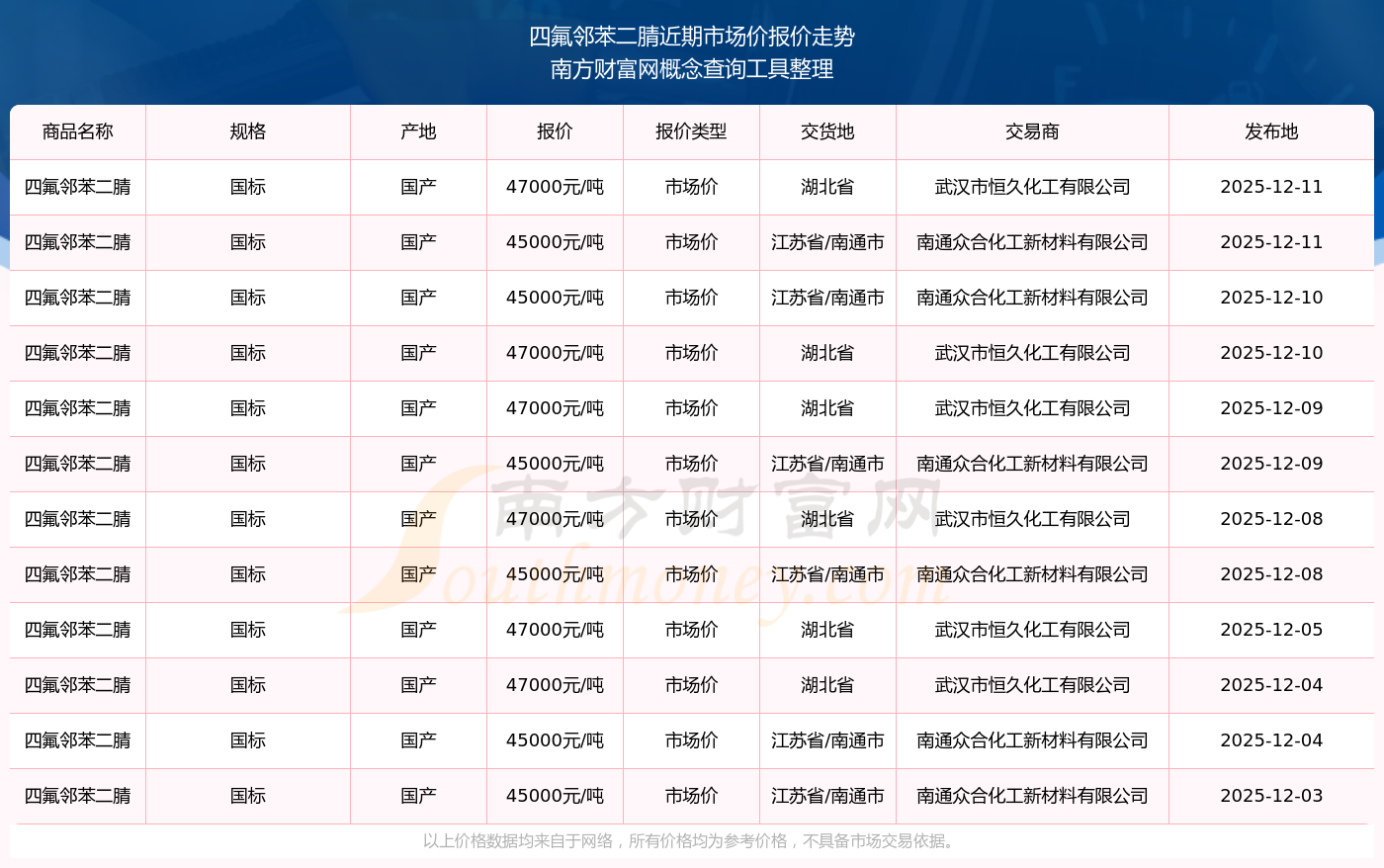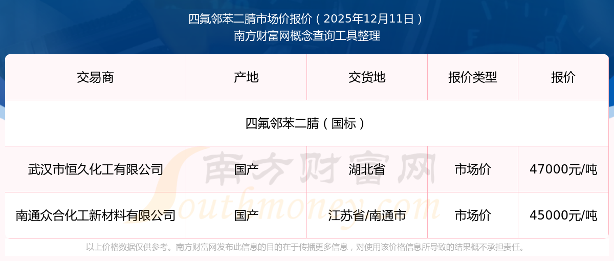 2025年12月11日,四氟鄰苯二腈(國標(biāo))市場價價格為45000.00元/噸,報價人:南通眾合化工新材料有限公司,交易地點為江蘇省/南通市。