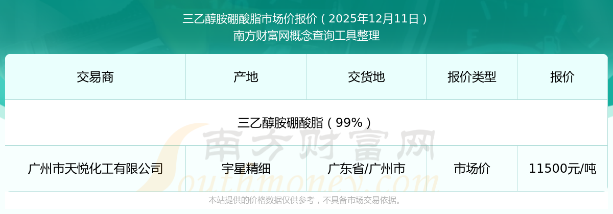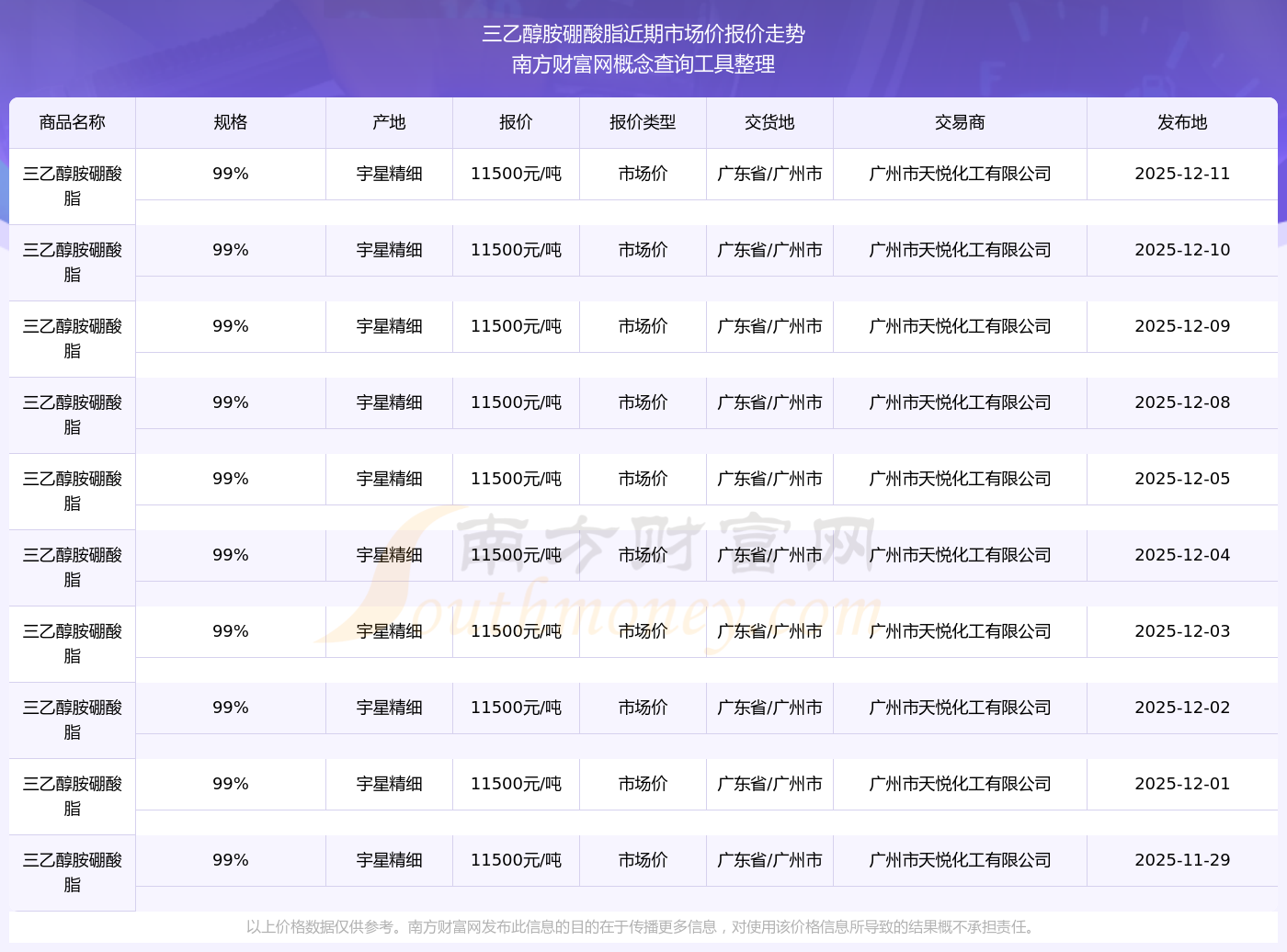 2025年12月11日,廣州市天悅化工有限公司三乙醇胺硼酸脂(99%),宇星精細,交易地點為廣東省/廣州市,市場價報價為11500.00元/噸。