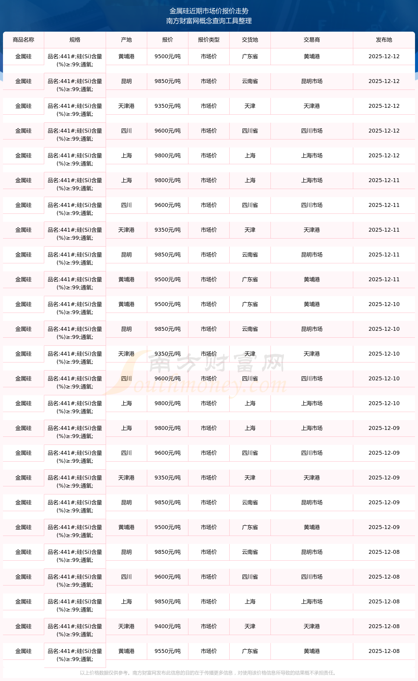 2025年12月12日,黃埔港金屬硅(品名:441#;硅(Si)含量(%)≥:99;通氧;),黃埔港,交易地點(diǎn)為廣東省,市場價(jià)報(bào)價(jià)為9500.00元/噸。