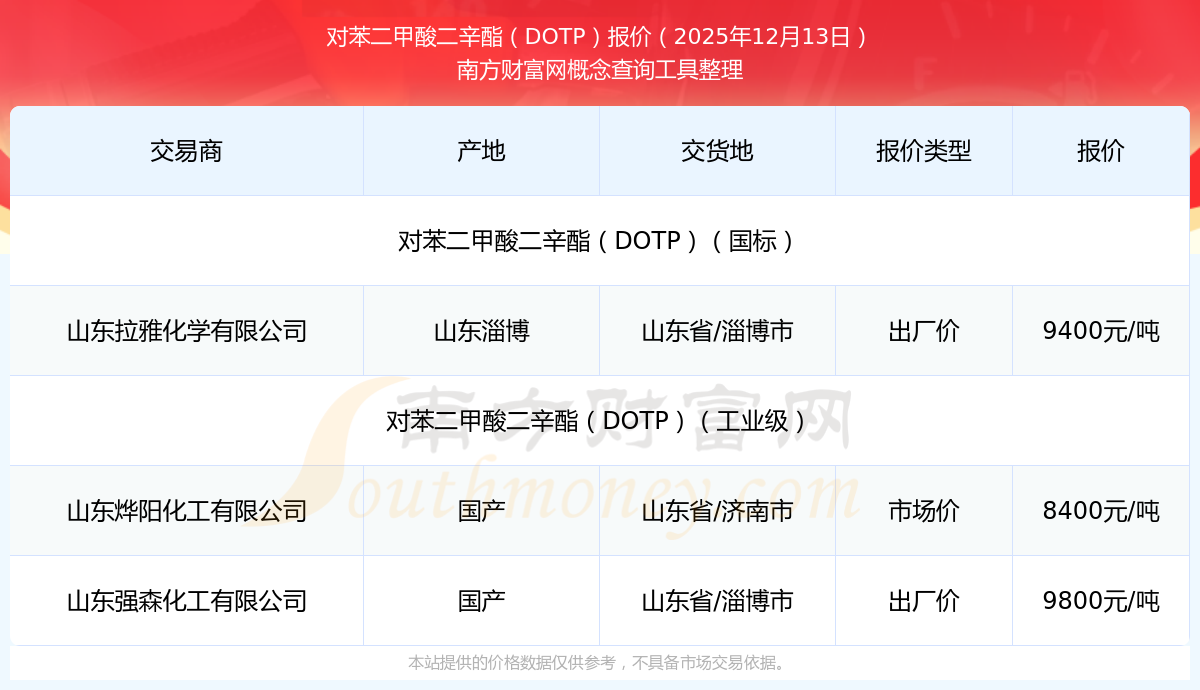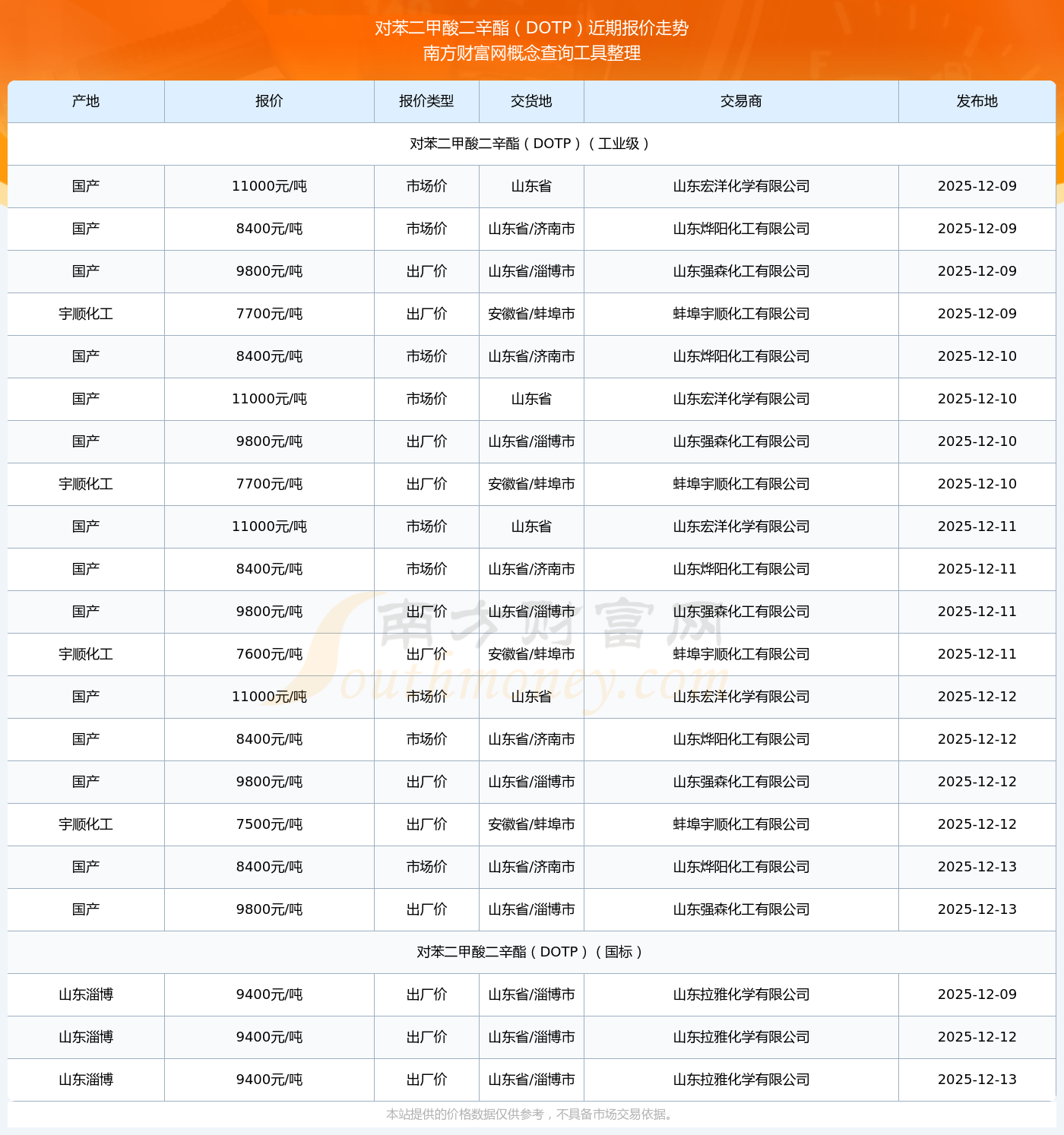 2025年12月13日對苯二甲酸二辛酯(DOTP)最新價格