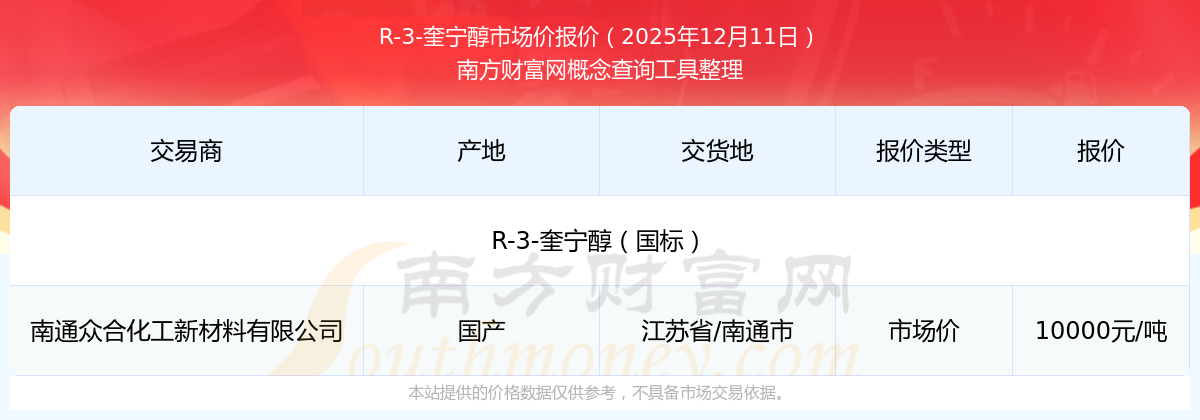 2025年12月11日,國(guó)產(chǎn),交易地點(diǎn)為江蘇省/南通市,市場(chǎng)價(jià)報(bào)價(jià)為10000.00元/噸。