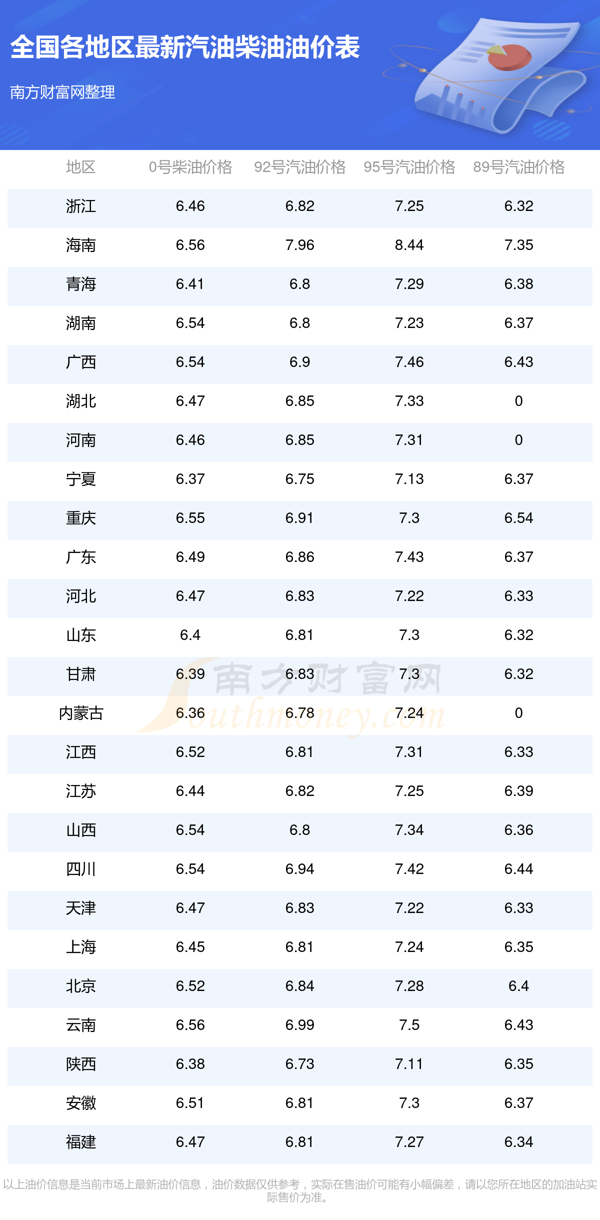 全國(guó)89號(hào)汽油平均價(jià)格為:6元每升,其中,最低為浙江,價(jià)格6.32元/升,最高為海南,價(jià)格7.35元/升。