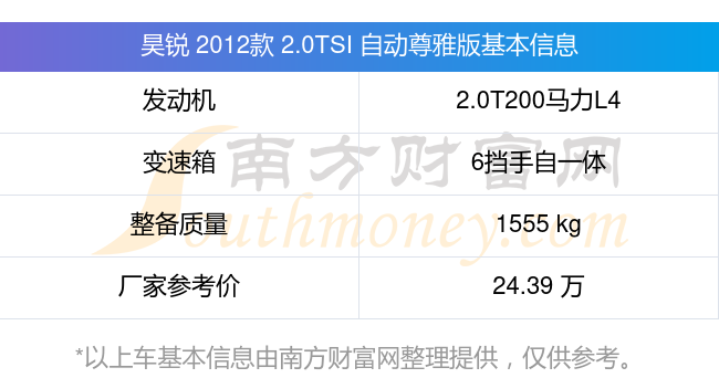 昊銳 2012款 2.0TSI 自動(dòng)尊雅版動(dòng)力上搭載的是一臺(tái)2.0T200馬力L4渦輪增壓發(fā)動(dòng)機(jī),匹配6擋手自一體自動(dòng)檔變速箱,燃料形式為汽油,常規(guī)整備質(zhì)量1555kg,廠家參考價(jià)24.39萬(wàn)元。