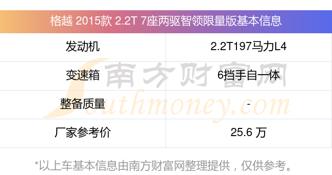 格越 2015款 2.2T 7座兩驅(qū)智領(lǐng)限量版動(dòng)力上搭載的是一臺(tái)2.2T197馬力L4渦輪增壓發(fā)動(dòng)機(jī),匹配6擋手自一體自動(dòng)檔變速箱,燃料形式為柴油,廠家參考價(jià)25.6萬(wàn)元。