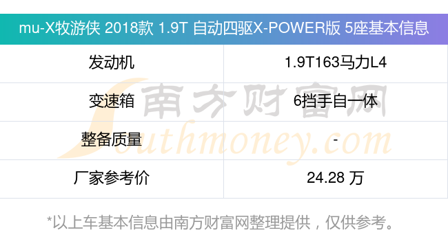 mu-X牧游俠 2018款 1.9T 自動四驅(qū)X-POWER版 5座動力方面,搭載的是一臺1.9T163馬力L4渦輪增壓發(fā)動機,匹配6擋手自一體自動檔變速箱,燃料形式為柴油,廠家參考價24.28萬元。