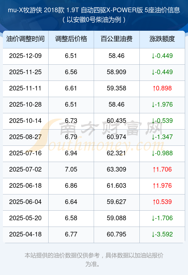 按照12月9日0號柴油最新調(diào)整價格6.51元/升來計算(以安徽為例),該車型百公里平均油費為58.46元,按照上一輪11月25日調(diào)整價格6.56元/升來計算,百公里平均油費為58.909元,對比上一輪少花0.449元,下一輪油價調(diào)整時間為12月22日24時。