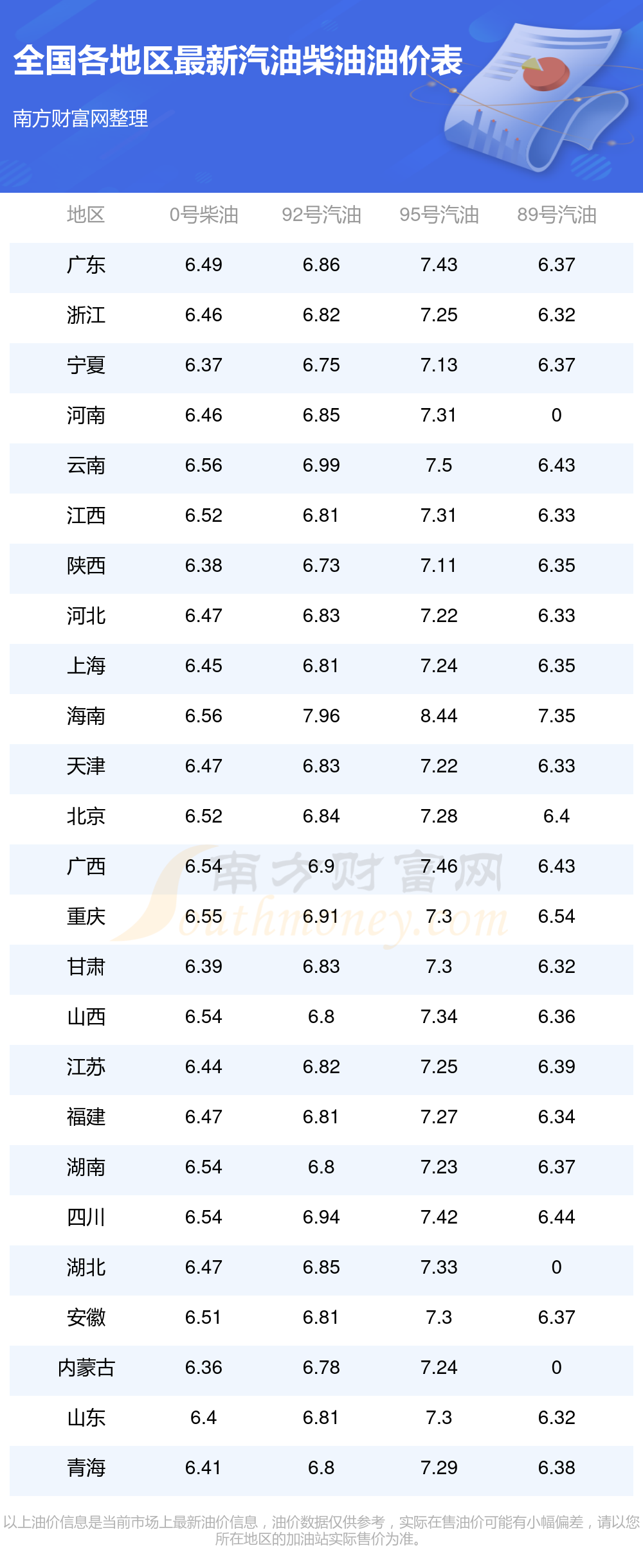 以上數據僅供參考,請以您所在地區(qū)的加油站實際售價為準。南方財富網發(fā)布此信息的目的在于傳播更多信息,對使用該油價信息所導致的結果概不承擔責任。