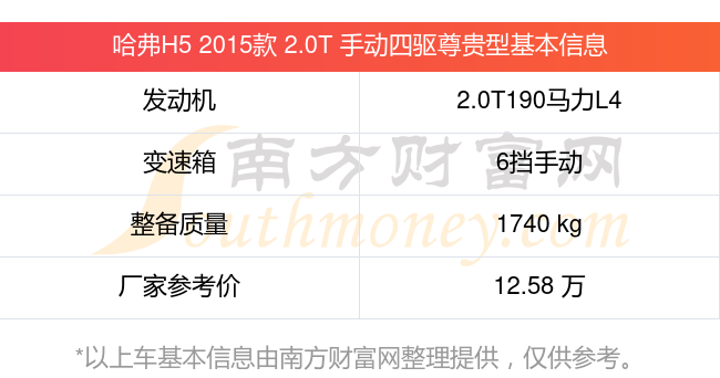 哈弗H5 2015款 2.0T 手動四驅(qū)尊貴型動力方面,搭載的是一臺2.0T190馬力L4渦輪增壓發(fā)動機,匹配6擋手動擋變速箱,燃料形式為汽油,常規(guī)整備質(zhì)量1740kg,廠家參考價12.58萬元。
