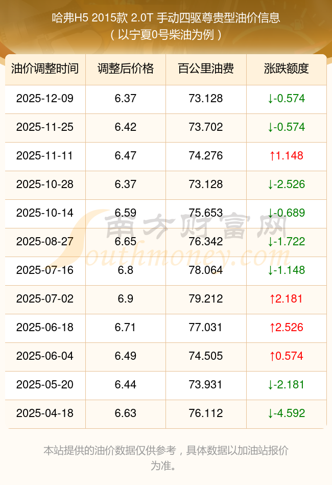 按12月9日0號柴油最新調(diào)整價格6.37元每升來計算(以寧夏為例),該車型百公里平均油費為73.128元,按上一輪11月25日調(diào)整價格6.42元每升來計算,百公里平均油費為73.702元,對比上一輪少花0.574元,下一輪油價調(diào)整時間為12月22日24時。