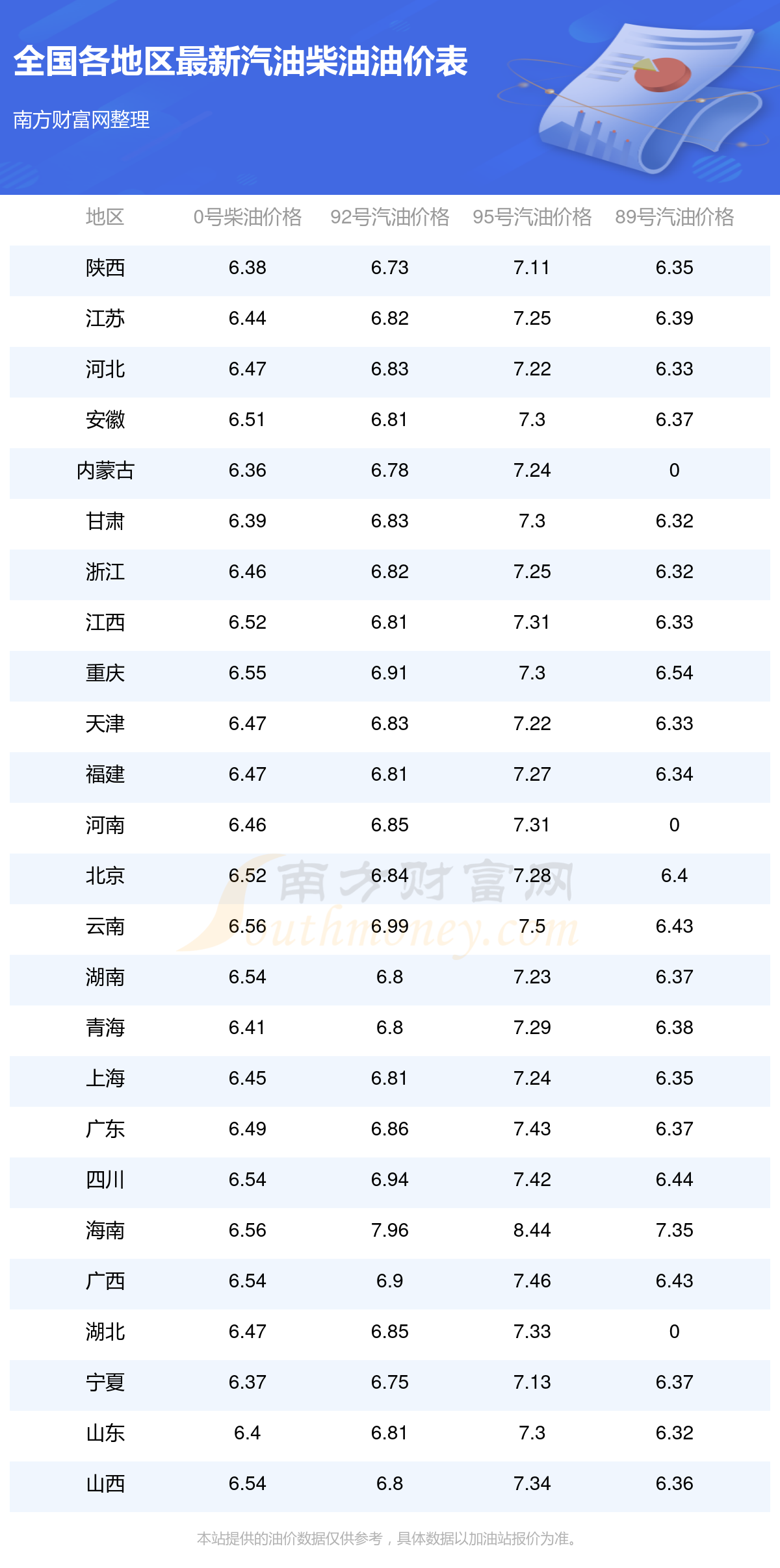 油價(jià)數(shù)據(jù)僅供參考,請(qǐng)以您所在地區(qū)的加油站報(bào)價(jià)為準(zhǔn)。南方財(cái)富網(wǎng)發(fā)布此信息的目的在于傳播更多信息,對(duì)使用該油價(jià)信息所導(dǎo)致的結(jié)果概不承擔(dān)任何責(zé)任。