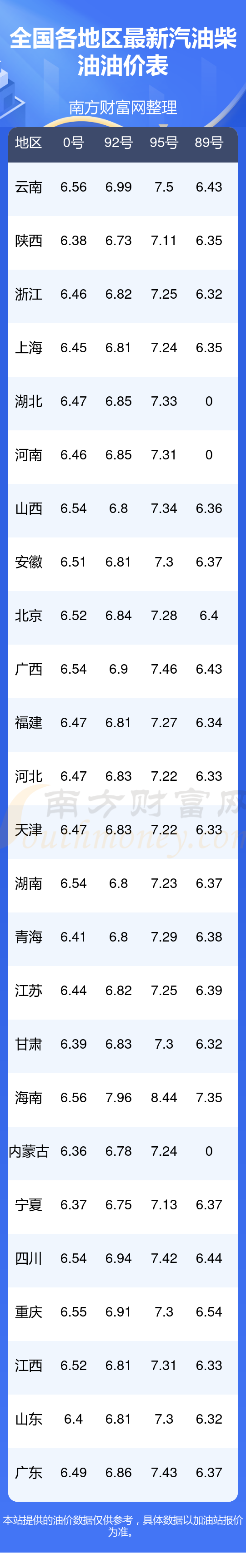 油價(jià)數(shù)據(jù)僅供參考,請(qǐng)以您所在地區(qū)的加油站報(bào)價(jià)為準(zhǔn)。南方財(cái)富網(wǎng)發(fā)布此信息的目的在于傳播更多信息,對(duì)使用該油價(jià)信息所導(dǎo)致的結(jié)果概不承擔(dān)任何責(zé)任。