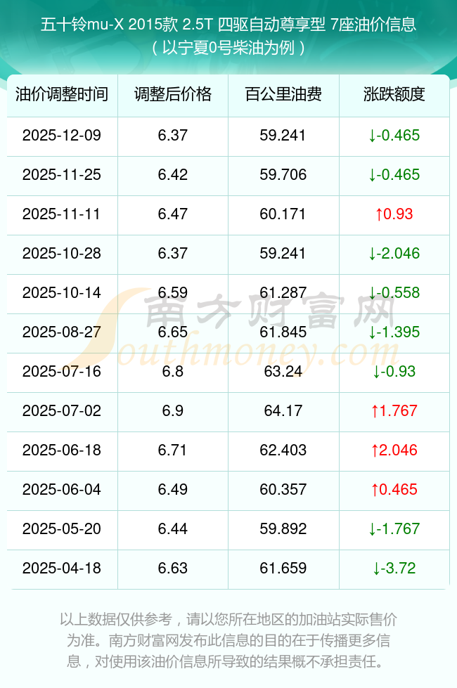 依照12月9日0號柴油最新調整價格6.37元/升來計算(以寧夏為例),該車型百公里的平均油費是59.241元,依照上一輪11月25日調整價格6.42元/升來計算,百公里的平均油費是59.706元,對比上一輪少花0.465元,下一輪的油價調整時間12月22日24時。