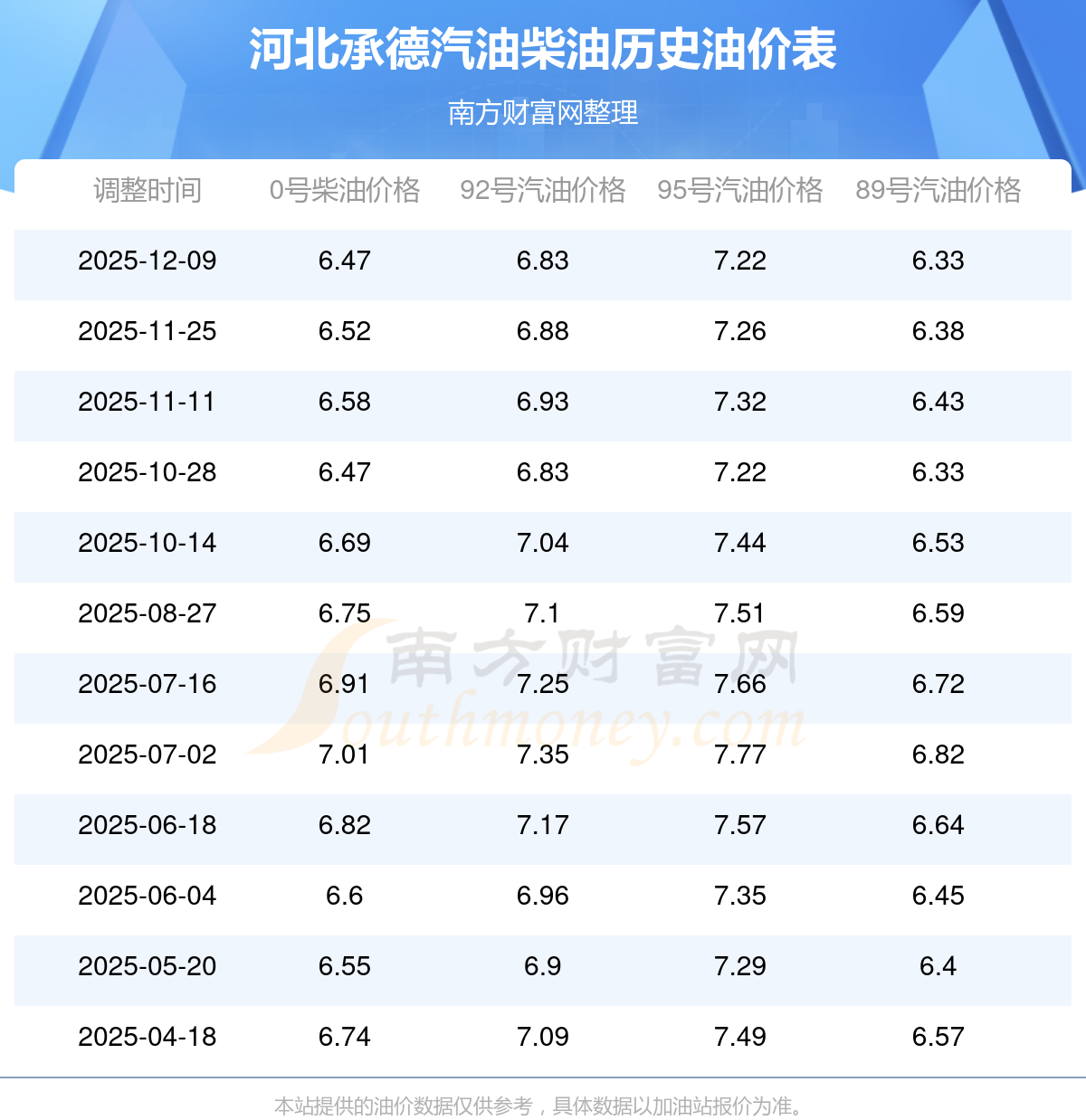 油價(jià)調(diào)整最新消息:12月14日河北承德汽油、柴油價(jià)格是多少錢(qián)一升?12月9日油價(jià)調(diào)整后,每升油價(jià)為:92號(hào)汽油為6.83元,下降了0.05元,下降幅達(dá)0.73%;95號(hào)汽油為7.22元,下降了0.04元,下降幅達(dá)0.55%;89號(hào)汽油為6.33元,下降了0.05元,下降幅達(dá)0.78%;0號(hào)柴油為6.47元,下降了0.05元,下降幅達(dá)0.77%。河北承德下一輪油價(jià)調(diào)整時(shí)間12月22日24時(shí),距離現(xiàn)在還有8.25天。
