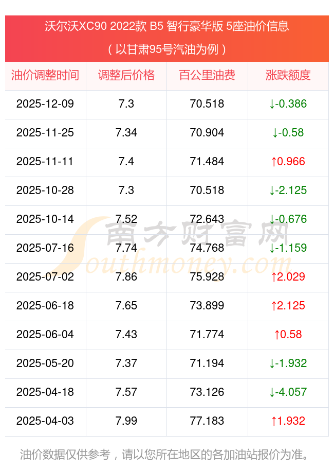 依照12月9日95號汽油最新調(diào)整價格7.3元/升來計算(以甘肅為例),該車型百公里的平均油費是70.518元,依照上一輪11月25日調(diào)整價格7.34元/升來計算,百公里的平均油費是70.904元,對比上一輪少花0.386元,下一輪的油價調(diào)整時間12月22日24時。