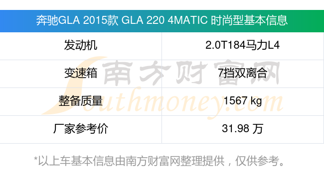 奔馳GLA 2015款 GLA 220 4MATIC 時(shí)尚型動(dòng)力上配備的是一臺(tái)2.0T184馬力L4渦輪增壓發(fā)動(dòng)機(jī),匹配的是7擋雙離合自動(dòng)檔變速箱,燃料形式為汽油,常規(guī)整備質(zhì)量1567kg,廠家參考價(jià)31.98萬(wàn)元。