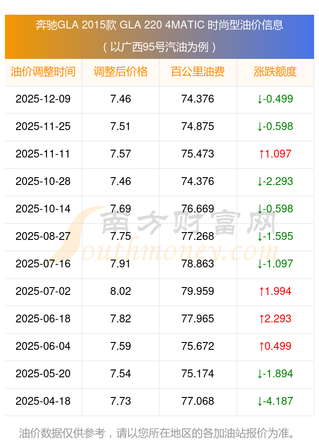 按照12月9日95號(hào)汽油最新調(diào)整價(jià)格7.46元/升來(lái)計(jì)算(以廣西為例),該車(chē)型百公里平均油費(fèi)為74.376元,按照上一輪11月25日調(diào)整價(jià)格7.51元/升來(lái)計(jì)算,百公里平均油費(fèi)為74.875元,對(duì)比上一輪少花0.499元,下一輪油價(jià)調(diào)整時(shí)間為12月22日24時(shí)。