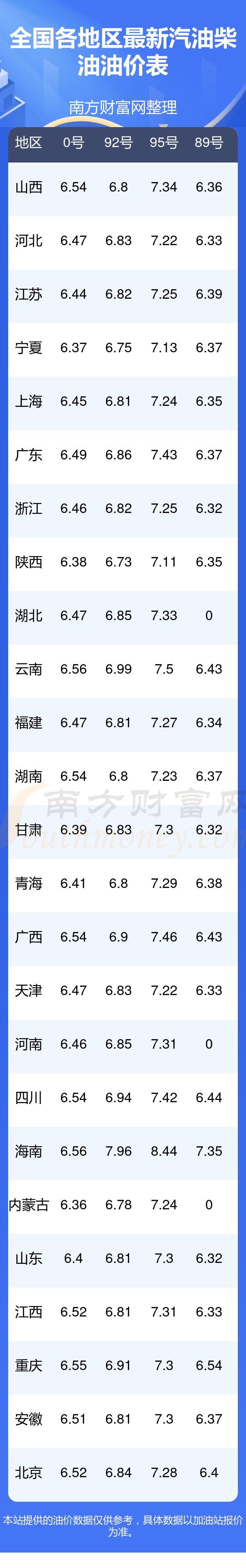 全國95號汽油最新平均價(jià)格為:7元每升,其中,最低為陜西,價(jià)格為7.11元/升,最高為海南,價(jià)格為8.44元/升。
