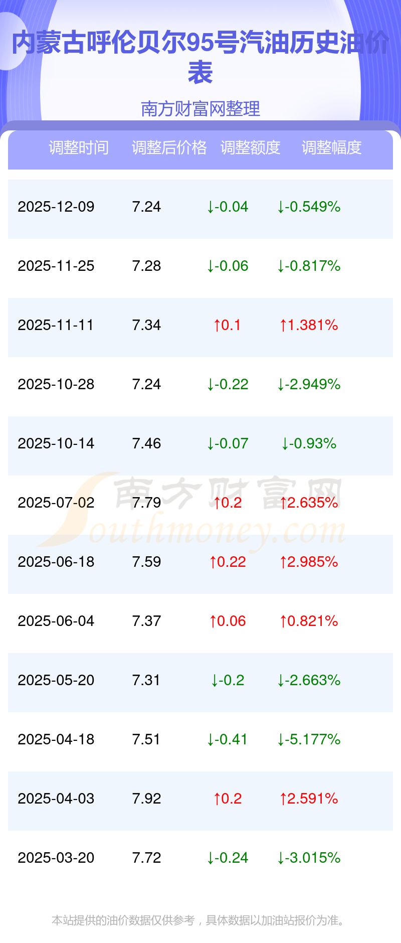 2025年95號(hào)汽油價(jià)格調(diào)整一覽表