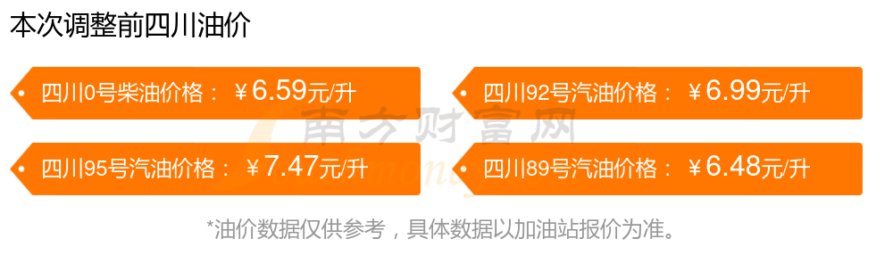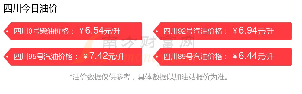 四川汽油、柴油12月14日每升最新價(jià)格為12月9日調(diào)整后的價(jià)格,92號汽油為6.94元,下調(diào)了0.05元;95號汽油為7.42元,下調(diào)了0.05元;89號汽油為6.44元,下調(diào)了0.04;0號柴油為6.54元,下調(diào)了0.05元。