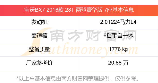 在動力上,寶沃BX7 2016款 28T 兩驅豪華版 7座配備的是一臺2.0T224馬力L4渦輪增壓發(fā)動機,匹配的是6擋手自一體自動檔變速箱,燃料形式為汽油,常規(guī)整備質(zhì)量1776kg,廠家參考價20.88萬元。