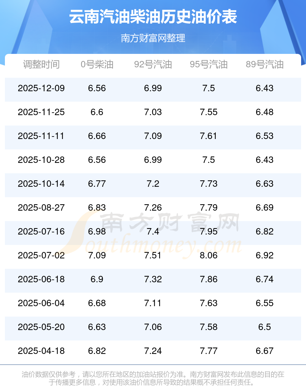云南0號(hào)柴油油價(jià)調(diào)整表