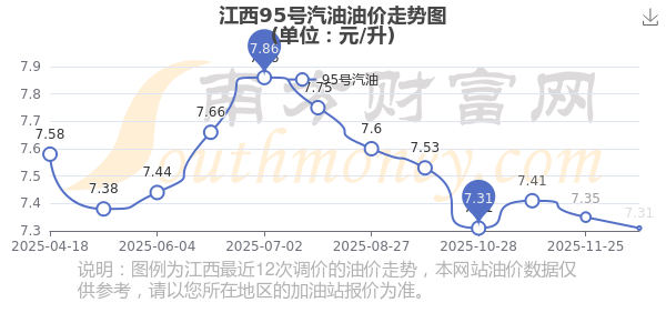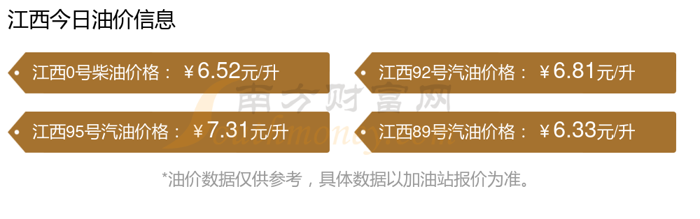 12月14日,江西汽油、柴油每升最新價格為:92號汽油為6.81元,下跌了0.04元;95號汽油為7.31元,下跌了0.04元;89號汽油為6.33元,下跌了0.04;0號柴油為6.52元,下跌了0.05元,調(diào)整時間為12月9日。