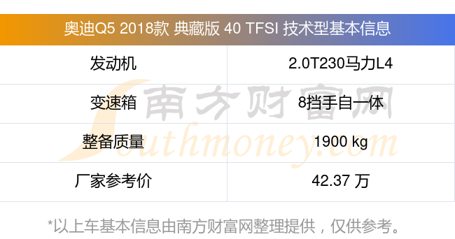 在動力上,奧迪Q5 2018款 典藏版 40 TFSI 技術(shù)型配備的是一臺2.0T230馬力L4渦輪增壓發(fā)動機(jī),匹配的是8擋手自一體自動檔變速箱,燃料形式為汽油,常規(guī)整備質(zhì)量1900kg,廠家參考價42.37萬元。