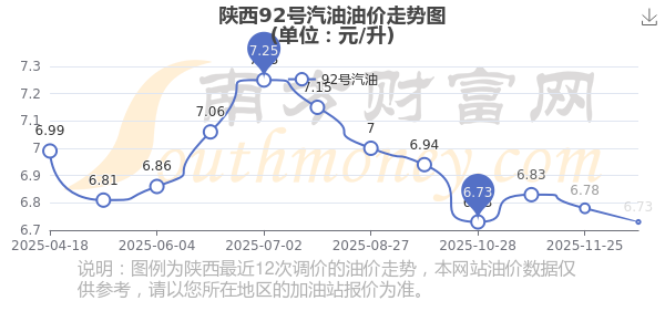 12月14日,陜西92號(hào)汽油的價(jià)格是6.73元每升,本次的調(diào)整時(shí)間為12月9日,對(duì)比上次的調(diào)整跌了0.05元,跌0.737%,下次調(diào)整時(shí)間為12月22日24時(shí),還有8.15天。