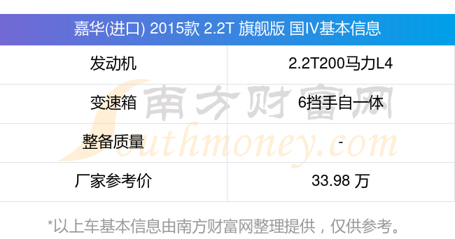 嘉華(進(jìn)口) 2015款 2.2T 旗艦版 國(guó)IV動(dòng)力上配備的是一臺(tái)2.2T200馬力L4渦輪增壓發(fā)動(dòng)機(jī),匹配的是6擋手自一體自動(dòng)檔變速箱,燃料形式為柴油,廠家參考價(jià)33.98萬元。