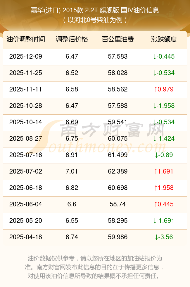 按12月9日0號(hào)柴油最新調(diào)整價(jià)格6.47元每升來計(jì)算(以河北為例),該車型百公里平均油費(fèi)為57.583元,按上一輪11月25日調(diào)整價(jià)格6.52元每升來計(jì)算,百公里平均油費(fèi)為58.028元,對(duì)比上一輪少花0.445元,下一輪油價(jià)調(diào)整時(shí)間為12月22日24時(shí)。