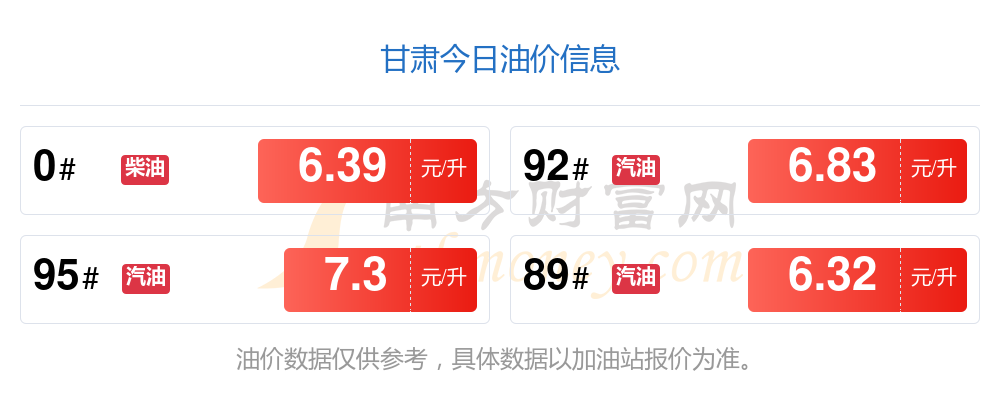 汽油價(jià)格調(diào)整最新消息:下一輪油價(jià)調(diào)整時(shí)間12月22日24時(shí)。12月14日甘肅汽油、柴油每升的價(jià)格是多少?12月9日為本輪油價(jià)調(diào)整時(shí)間,92號(hào)汽油6.83元,減了0.05元,減幅達(dá)0.73%;95號(hào)汽油7.3元,減了0.04元,減幅達(dá)0.55%;89號(hào)汽油6.32元,減了0.04元,減幅達(dá)0.63%;0號(hào)柴油6.39元,減了0.05元,減幅達(dá)0.78%。