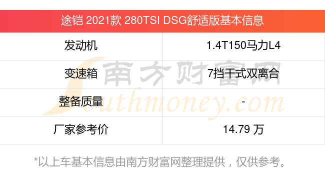 途鎧 2021款 280TSI DSG舒適版動(dòng)力上配備的是一臺(tái)1.4T150馬力L4渦輪增壓發(fā)動(dòng)機(jī),匹配的是7擋干式雙離合自動(dòng)檔變速箱,燃料形式為汽油,廠家參考價(jià)14.79萬(wàn)元。