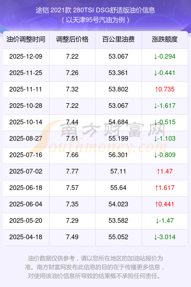 按照12月9日95號(hào)汽油最新調(diào)整價(jià)格7.22元/升來(lái)計(jì)算(以天津?yàn)槔?,該車型百公里平均油費(fèi)為53.067元,按照上一輪11月25日調(diào)整價(jià)格7.26元/升來(lái)計(jì)算,百公里平均油費(fèi)為53.361元,對(duì)比上一輪少花0.294元,下一輪油價(jià)調(diào)整時(shí)間為12月22日24時(shí)。