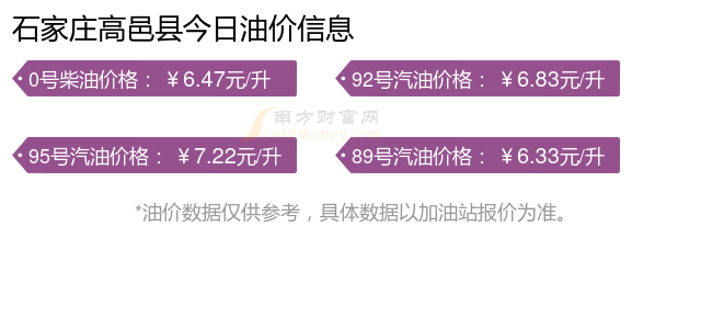 12月14日,石家莊高邑縣汽油、柴油每升最新價(jià)格:本輪的油價(jià)調(diào)整時(shí)間是12月9日,92號(hào)汽油為6.83元,下降了0.05元,下降幅達(dá)0.73%;95號(hào)汽油為7.22元,下降了0.04元,下降幅達(dá)0.55%;89號(hào)汽油為6.33元,下降了0.05元,下降幅達(dá)0.78%;0號(hào)柴油為6.47元,下降了0.05元,下降幅達(dá)0.77%。