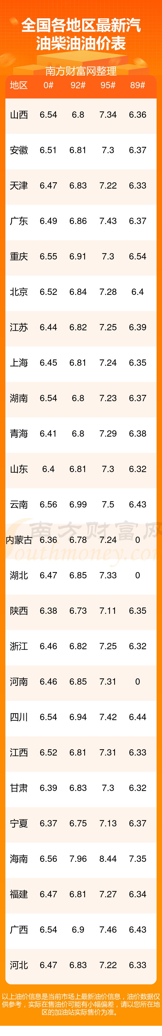 以上數(shù)據(jù)僅供參考,請(qǐng)以您所在地區(qū)的加油站實(shí)際售價(jià)為準(zhǔn)。南方財(cái)富網(wǎng)發(fā)布此信息的目的在于傳播更多信息,對(duì)使用該油價(jià)信息所導(dǎo)致的結(jié)果概不承擔(dān)責(zé)任。