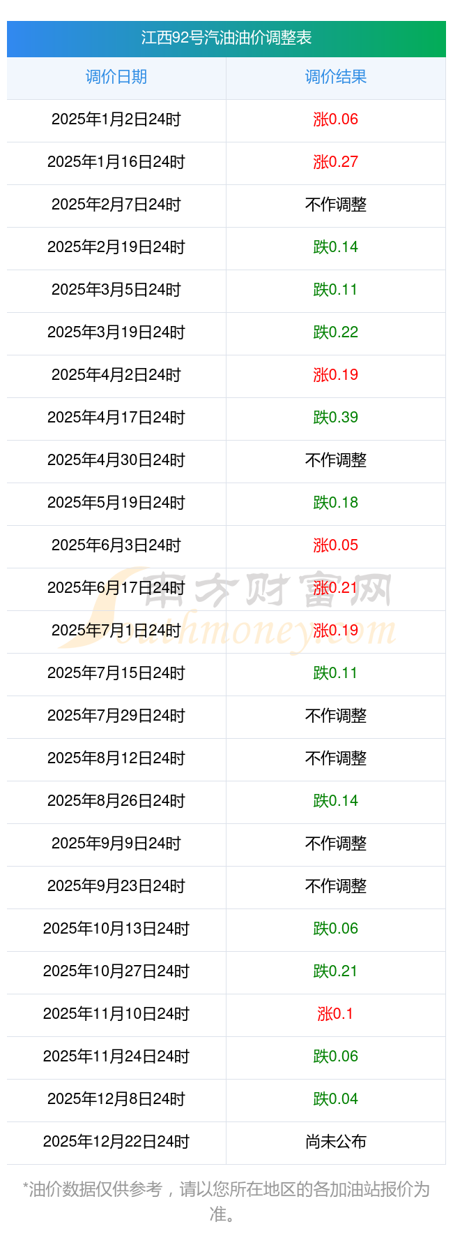 12月14日,江西92號汽油的價格是6.81元每升,本次的調(diào)整時間為12月9日,對比上次的調(diào)整降了0.04元,降0.584%,下次調(diào)整時間為12月22日24時,還有8.13天。