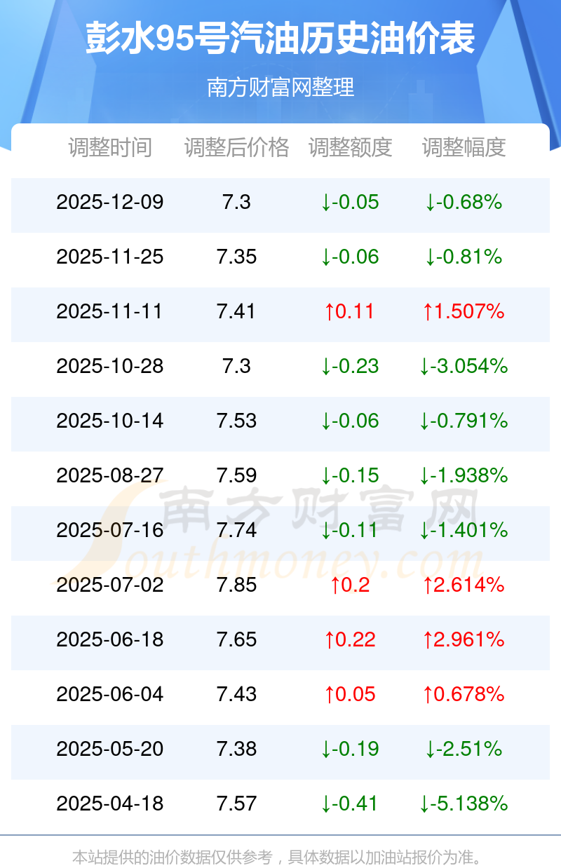 2025年95號汽油價(jià)格調(diào)整一覽表