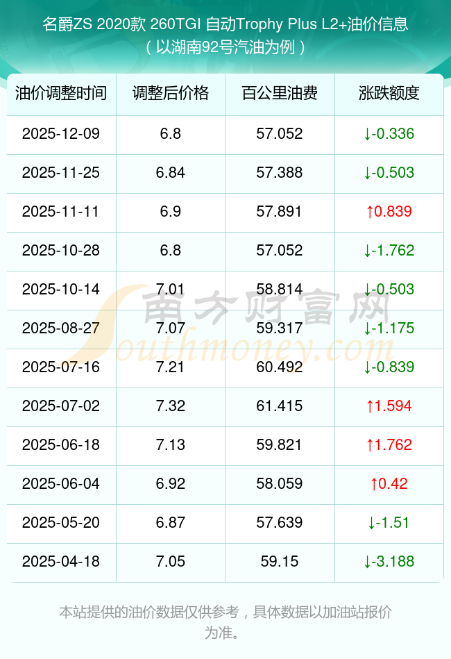根據(jù)12月9日92號汽油最新調(diào)整價格6.8元/升來計算(以湖南為例),該車型每百公里的平均油費(fèi)是57.052元,上一輪11月25日調(diào)整價格6.84元每升來計算,每百公里的平均油費(fèi)是57.388元,對比上一輪少花0.336元,下一輪的油價調(diào)整時間是12月22日24時。
