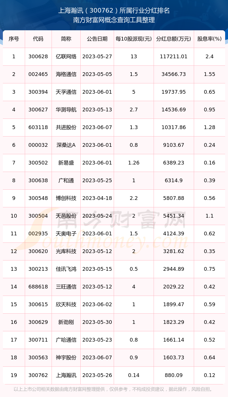 按照南方財(cái)富網(wǎng)趨勢(shì)選股系統(tǒng)統(tǒng)計(jì),上海瀚訊所屬行業(yè)為通信設(shè)備行業(yè),通信設(shè)備行業(yè)分紅排名情況如下表: