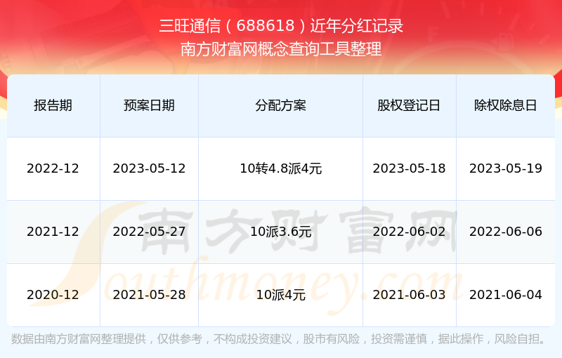 三旺通信最新一次公布的分紅方案:10轉(zhuǎn)4.8派4元。