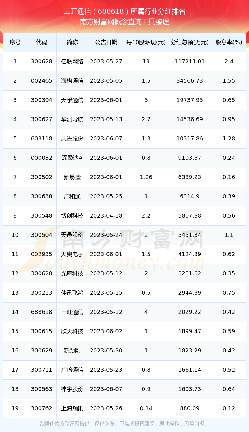 按照南方財(cái)富網(wǎng)趨勢(shì)選股系統(tǒng)統(tǒng)計(jì),三旺通信所屬行業(yè)為通信設(shè)備行業(yè),通信設(shè)備行業(yè)分紅排名情況如下表: