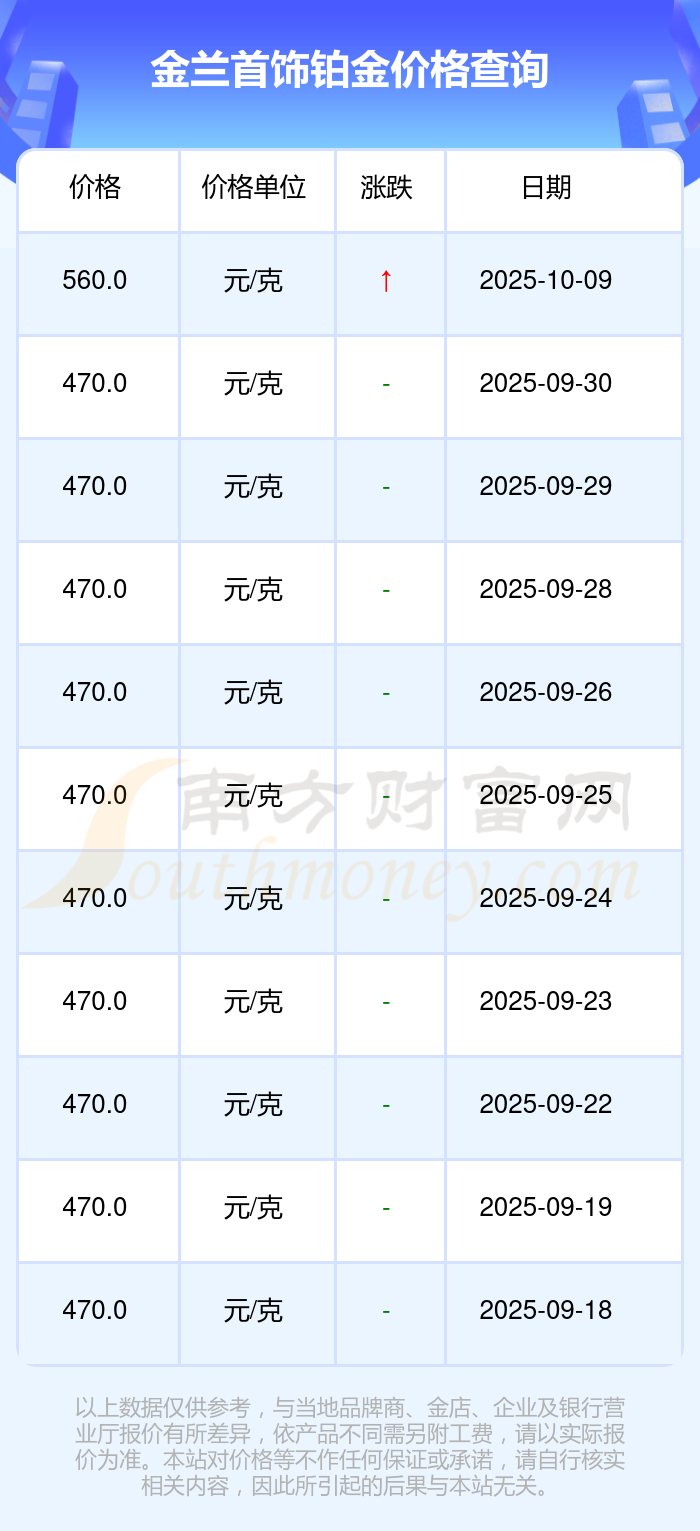 今日(2025年10月10日),金蘭首飾鉑金價(jià)格最新價(jià)格是560.0元/克。